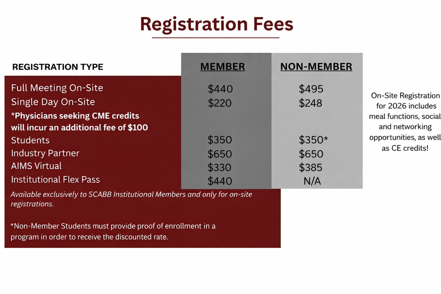 Prior to the Early Bird Registration cutoff date on December 15, 2025, all full meeting, single day, and student registrations will have a $50 discount from the prices listed above. After December 15, all registrations will incur the full cost. There is no "Exhibit Hall Only" registration option. All registrants must be individually registered, and conference pre-registration is accepted online only. Registrations cannot be shared (excluding Institutional Flex Passes). Attendees may register online until March 6, 2026, after which registrations will only be accepted on-site during conference hours. Cash, checks, and credit cards will be the accepted methods of payment on-site.